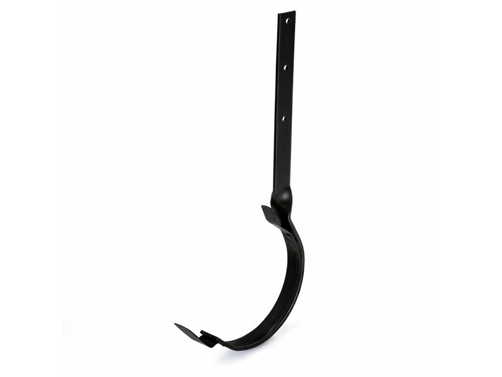 Kroucený žlabový hák z pozinkované oceli, následně lakovaný do elegantní černé barvy RAL 9005. Určený pro pevné uchycení okapového žlabu o rozměru 280 mm s možností přizpůsobení sklonu střechy. Kombinace zinkování a kvalitního laku zajišťuje vysokou odolnost proti korozi, dlouhou životnost a jednotný, moderní vzhled okapového systému.